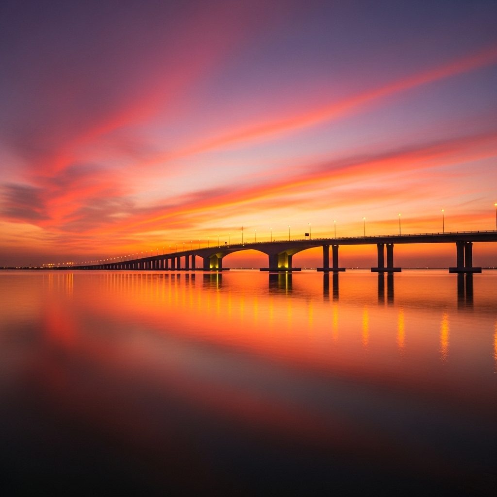 A cinematic wide-angle sunset view near Bahrain Bridge. The sky is painted with dramatic orange, pink, and purple tones, reflecting across the water. The bridge silhouettes in the distance, glowing with evening lights.