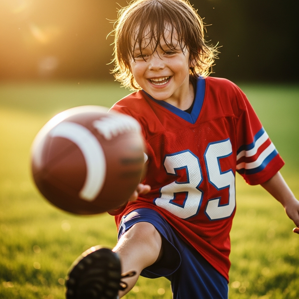 A mid-range cinematic close-up of a 7-year-old boy playing football in a grassy field. The ball is mid-air, his joyful face glowing in natural sunlight. Highly realistic, dynamic motion, capturing pure childhood energy.