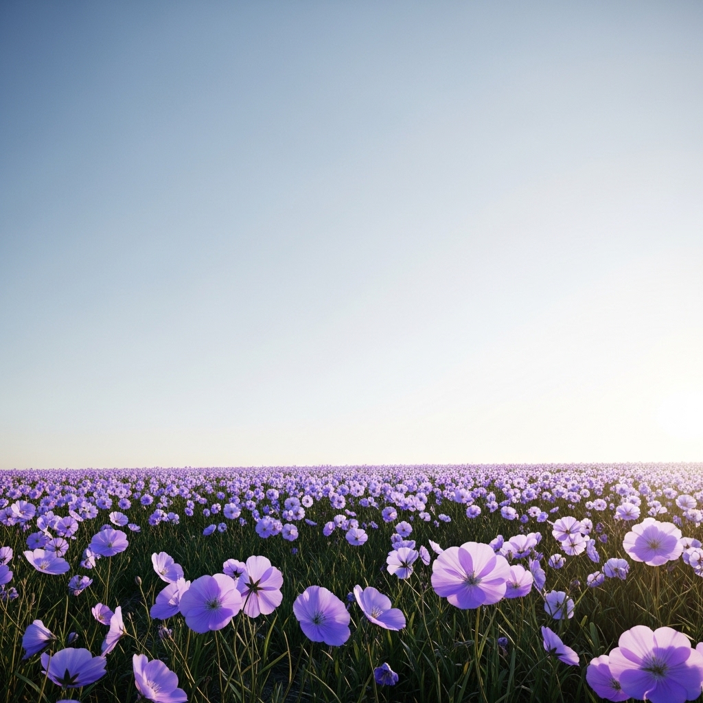 A soft cinematic shot of a meadow with scattered wildflowers in light purple and blue shades (#5147E6, #885BF5). The frame leaves wide open sky above, perfect for text overlay. Calm, realistic, and minimal.