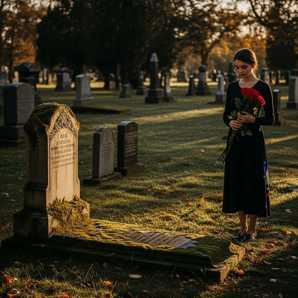 A wide-angle cinematic shot of a young woman in a black outfit, standing silently near a grave. She holds bright red flowers in her hands, evening golden light falling softly across the grass.