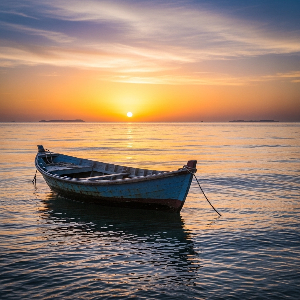 A mid-range cinematic shot of a small wooden boat floating on calm ocean waters. The horizon glows with golden sunlight, waves gently shimmering, creating a breathtaking scene.
