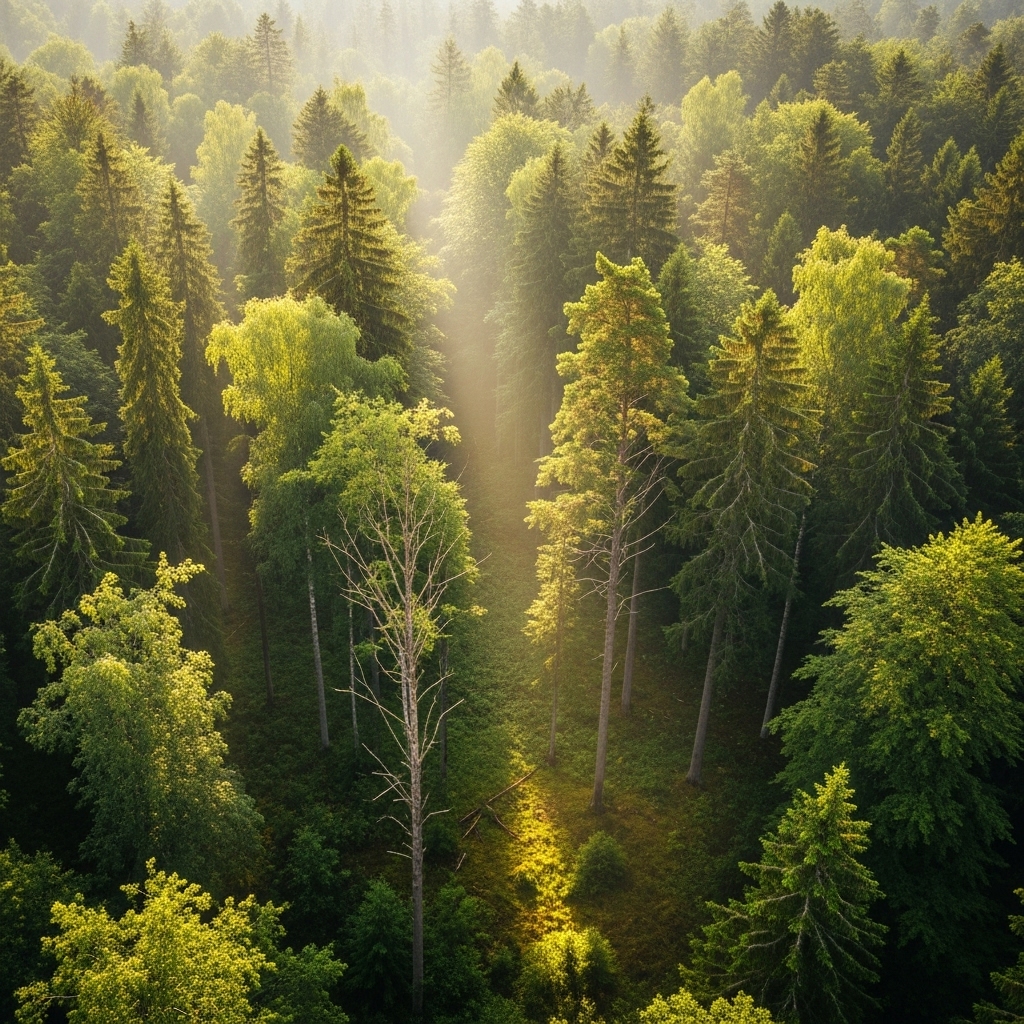 A wide-angle aerial shot of a lush forest. Tall green trees stretch endlessly with rays of sunlight piercing through the branches. The cinematic frame captures depth, scale, and nature’s quiet magic.